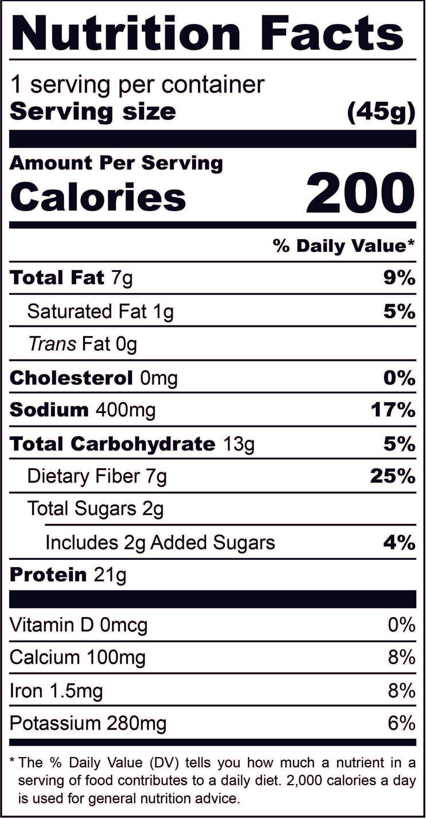 • Nutrition Facts label for one 45g serving. Full nutritional breakdown is listed in the product description below